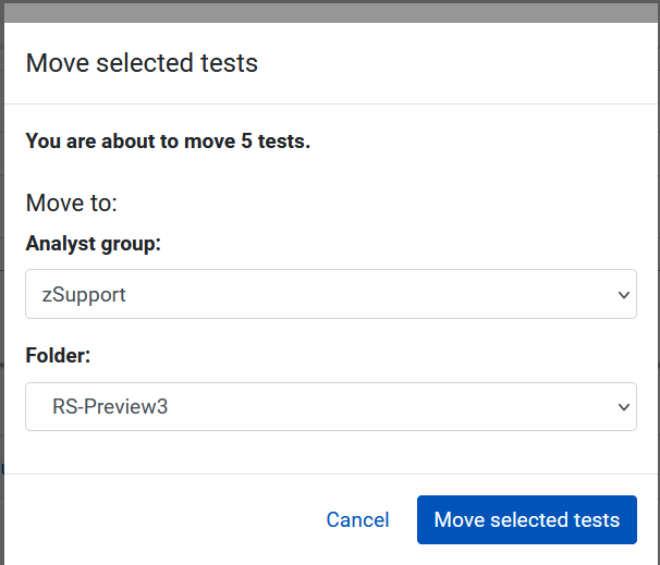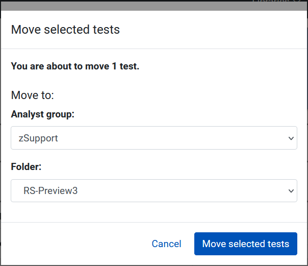 - click Move. If you are presented with the Analyst group dropdown list, that means that you have access to multiple analyst groups. Select the group you wish to move your test or tests to.