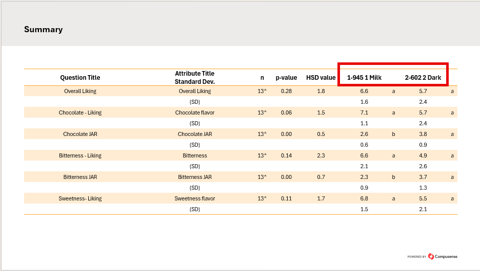 - Show comparison letters. Default selection. Control whether the comparison letters will be included in the table. Further down on the page, there is an option that enables you to display comparison letters only when there is significant difference between samples.