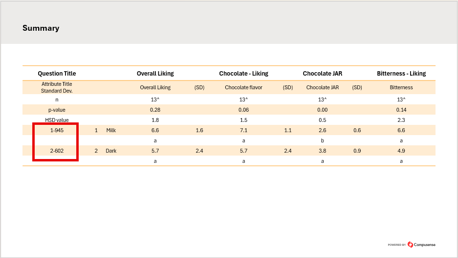 - Blinding code. Deselected by default. When selected (checked), the Blinding Code column is displayed in the report, listing the sample blinding codes as set in the Samples & design tab of your test. Below are example images from a Standard test type and a Triangle test type.