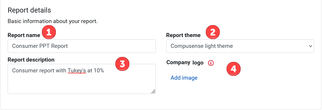 - Company logo. Click Add image to insert your preferred logo in the top right-hand corner of your report. Image file should be .png or .jpg file type. The imported logo will appear in all slides except for the title and information slides. All new reports generated using the collection you added a logo to will have the logo included in them.