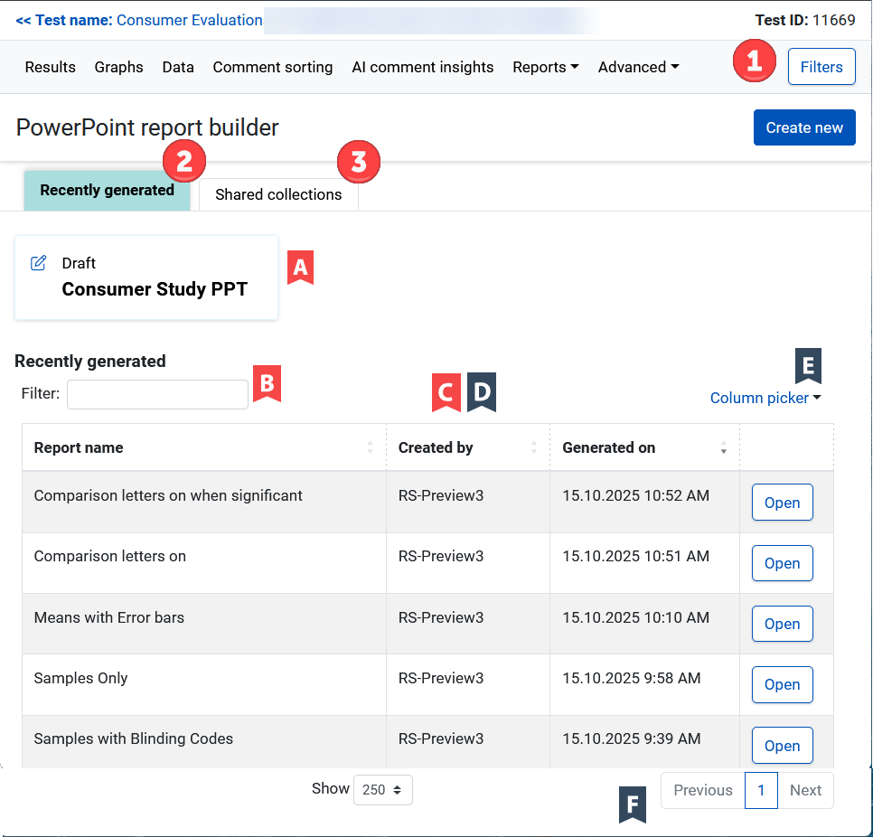 - If you return to the PowerPoint report builder screen, you will see in the Recently generated tab that your own collection was created with the changes you applied.