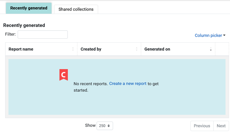 Column picker. Click and choose which columns are displayed in the table. If it happens that there are two or more shared collections with the same name, display the Report ID column to easily identify which report collection was more recently created (the higher the Report ID, the more recent the collection creation date is).