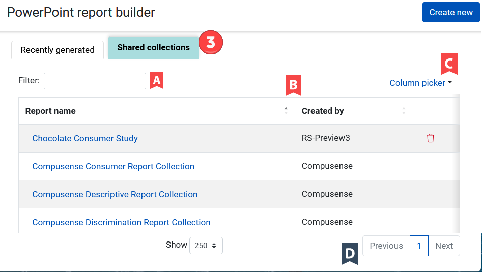 - On the right side of the PowerPoint report builder screen, click Create new.