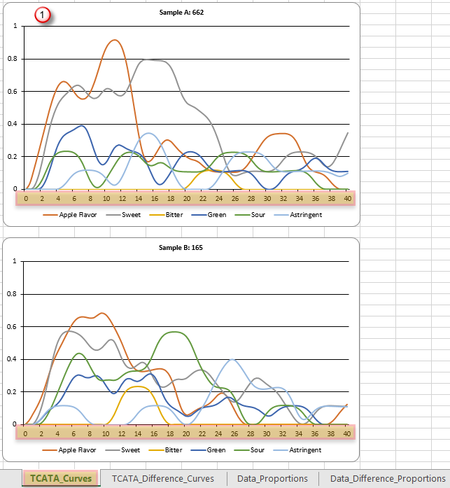 TCATA Curves. Displays the average of all complete responses for all included samples. There is one graph per sample.